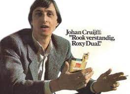 De foto van deze rokende Johan Cruijff dateert uit 1977. Destijds rookte het complete Nederlandse elftal. In iedere huiskamer stond op de salontafel een asbak en verschenen er op verjaardagen borrelglaasjes gevuld met filtersigaretten. Diezelfde Cruijff maakte toen reclame voor het sigarettenmerk Dual van de Groningse sigarettenfabrikant Niemeyer.